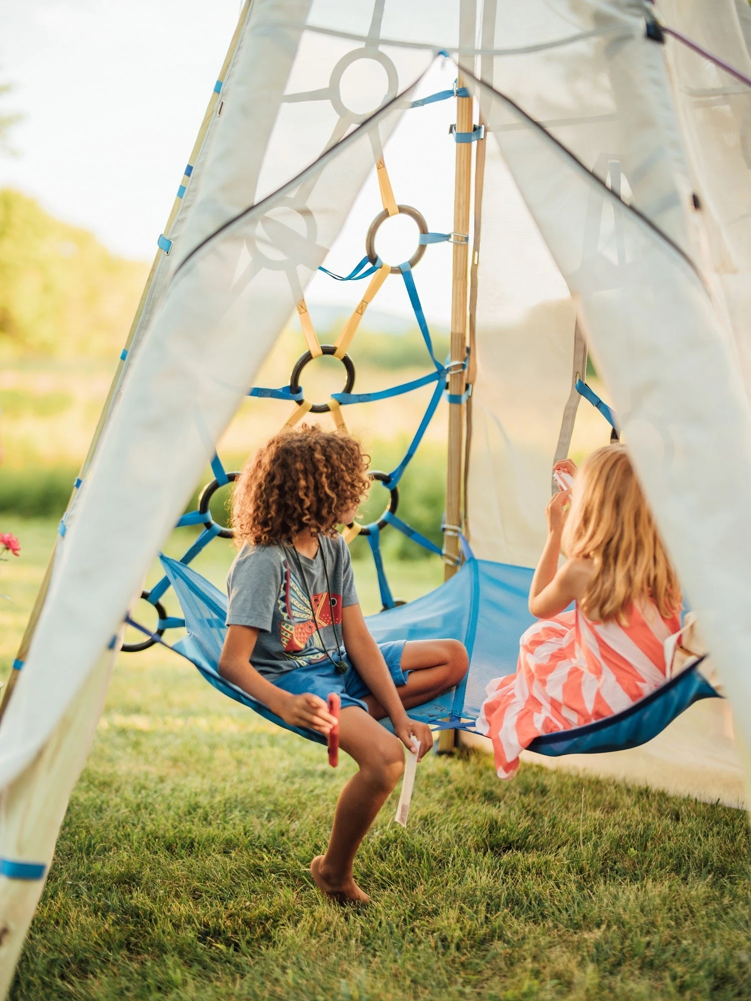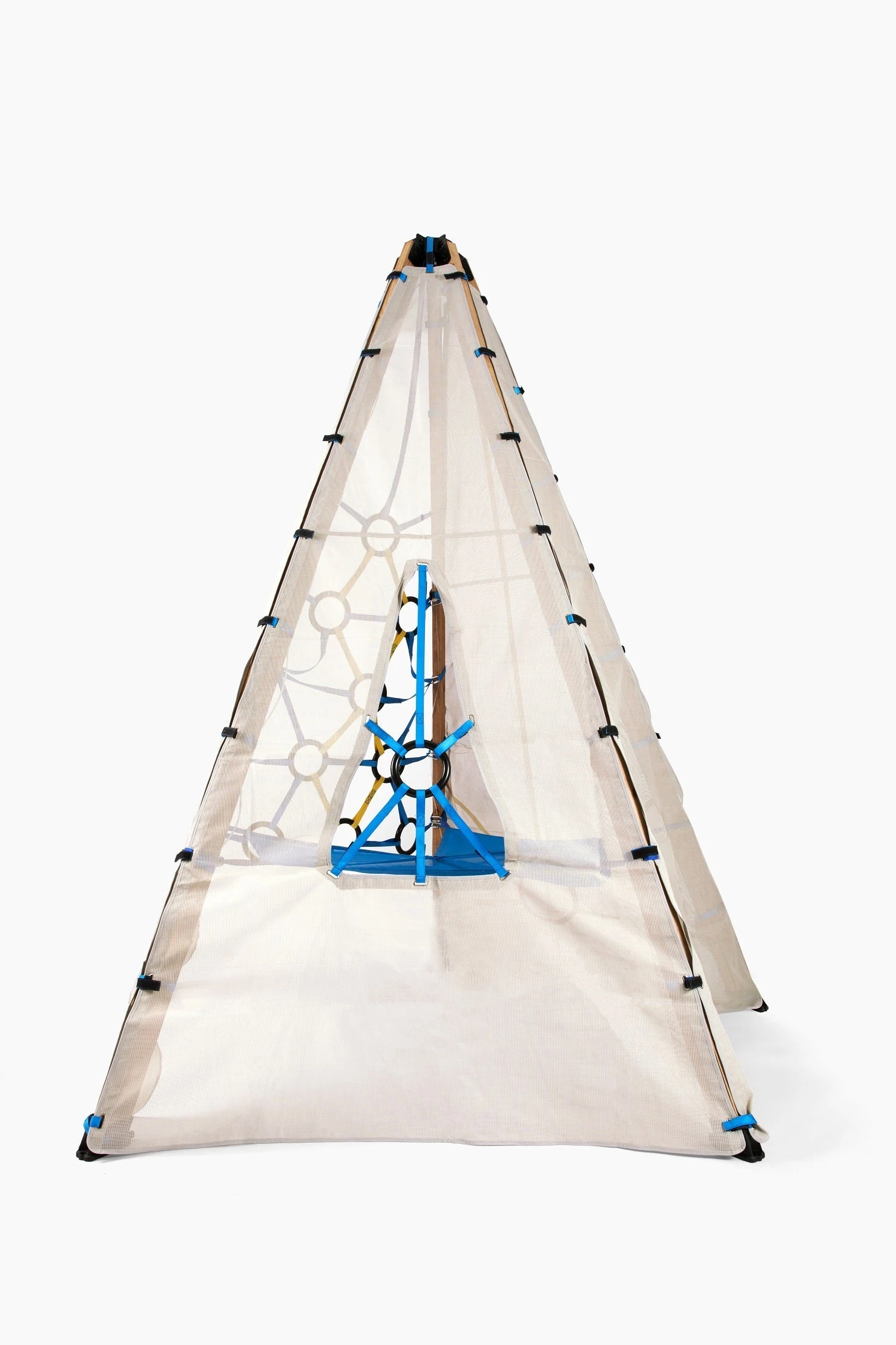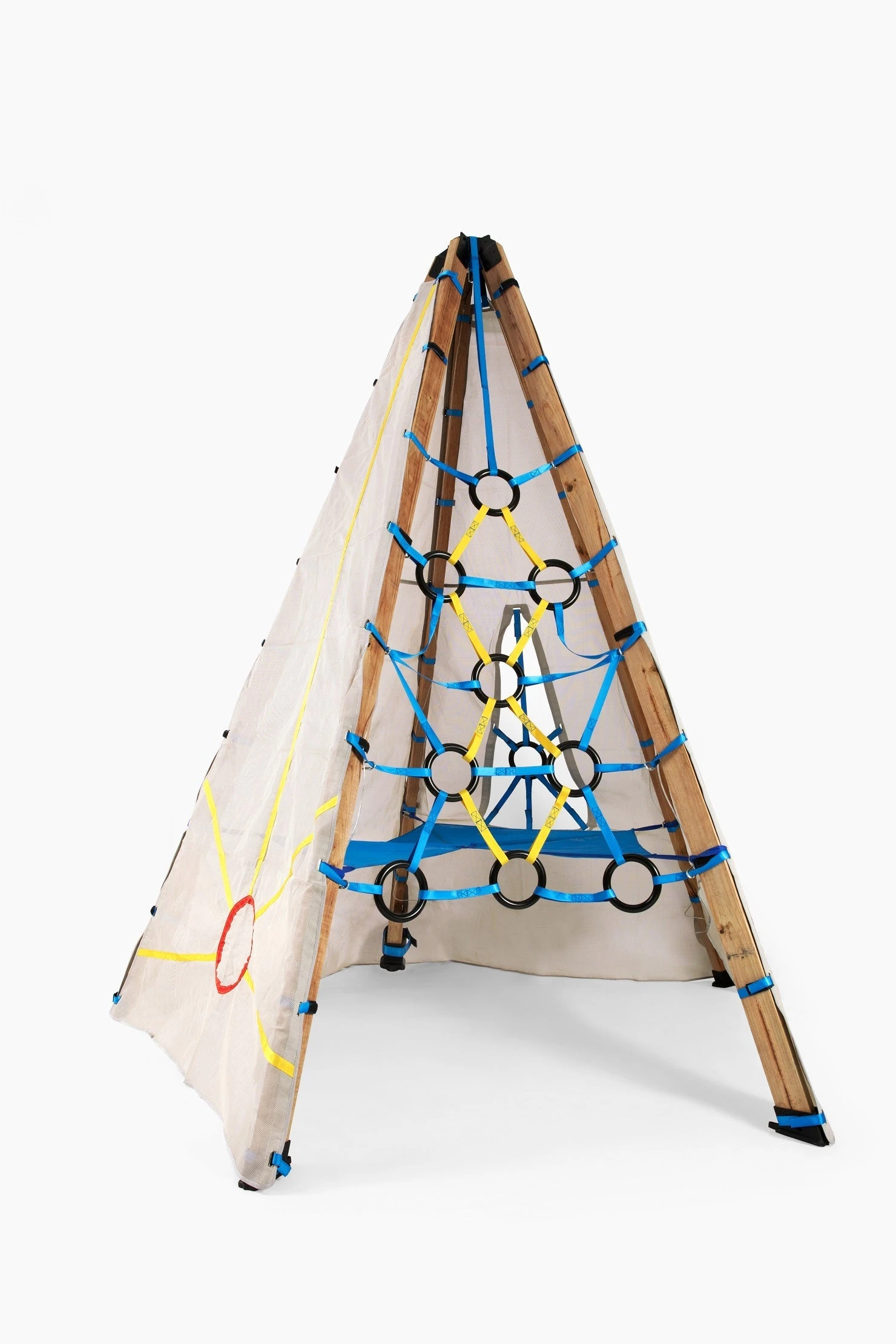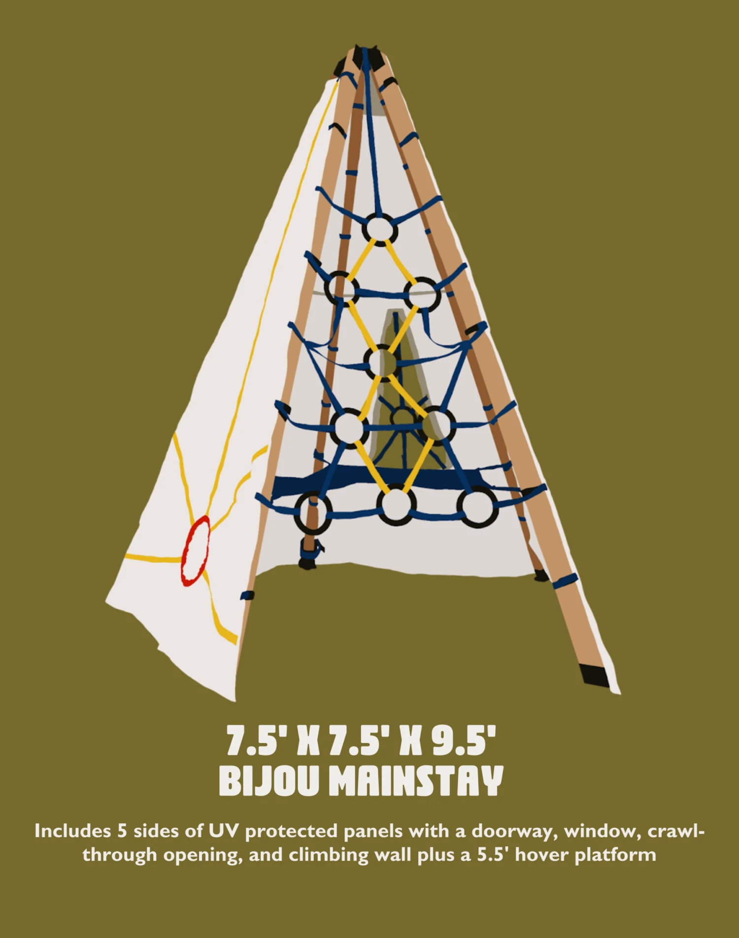 Bijou is a revolutionary collapsible play system that can quickly expand and adapt to your family’s needs. It also has the strength to withstand harsh outdoor conditions, allowing it to remain up 365 days a year. It is crafted from powder-coated steel, UV-resistant recycled water bottle panels, and stainless steel hardware. It supports up to 250 lbs. and is designed for ages 3+.