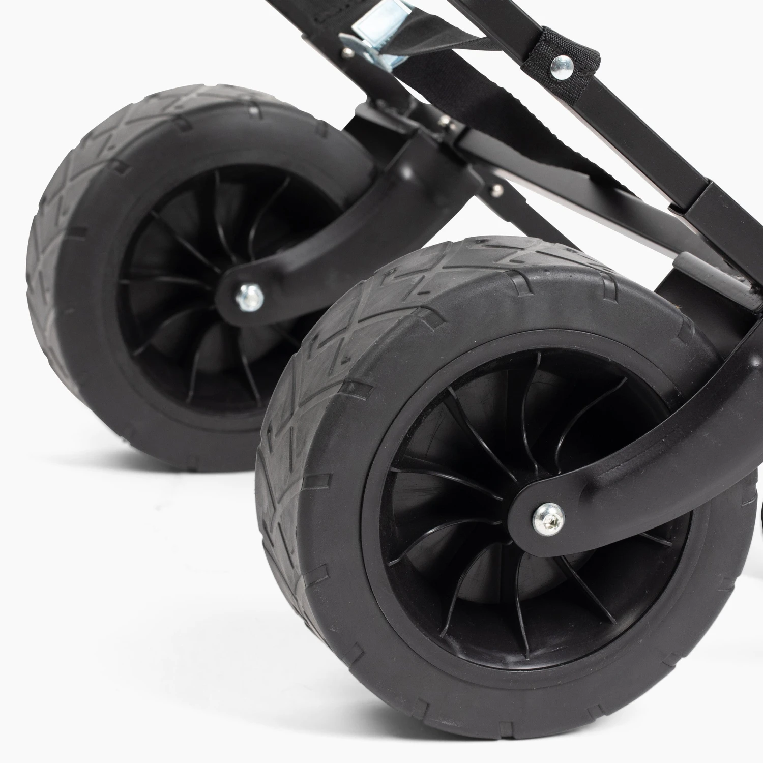 No tools required – simply snap together for assembly. With large rubberized wheels, rough terrain is no match for your Bijou on the go. Use the included cam straps and velcro handles from your Mainstay or Haven to secure and roll away with ease.