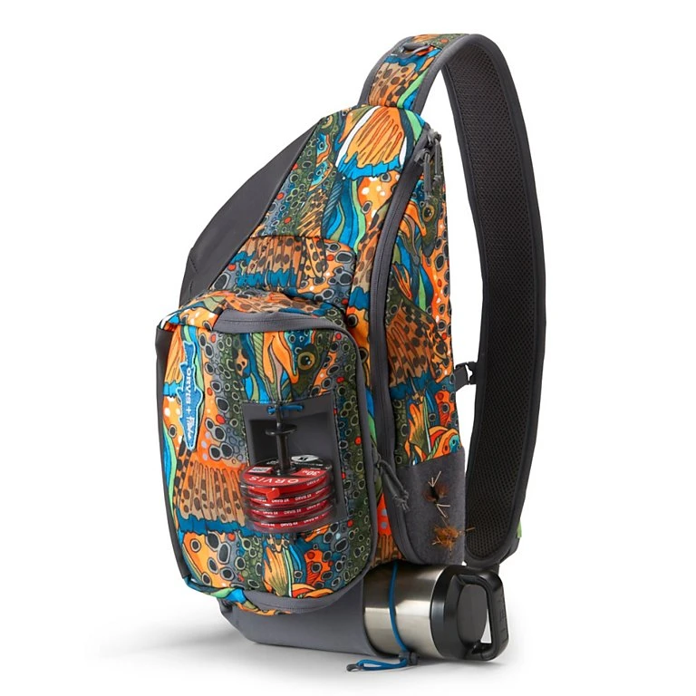 The best-selling Orvis fly-fishing Sling Pack has been updated and improved not only for durability, but with innovative new convenience features as well. The 100% recycled CORDURA® re/cor™ platform is designed to store, organize, and offer easy, intuitive accessibility while staying completely out of your way when fishing. New features include the patented Tippet Whippet recessed docking station with tippet bar included for instant, fixed, and fumble-free access for up to six spools. Main compartment has zippered security pocket with key fob and stretch mesh pockets for small sort storage. Front drop-down has zippered pocket with elastic mesh slip pockets. Lo-pro zinger/nipper pass-through, easy swing handle, and water bottle holder with retainer. Front strap “dashboard” offers multiple docking stations for forceps and small tools as well as sliding adjustment for sternum strap. Left shoulder design frees up casting arm and shoulder. Weight: 500g/1.1 lbs.