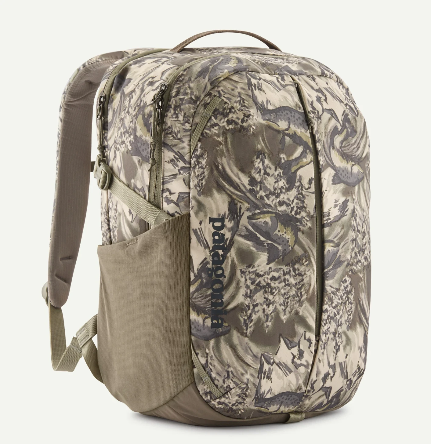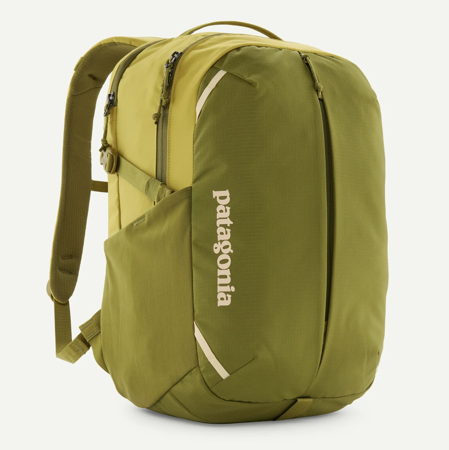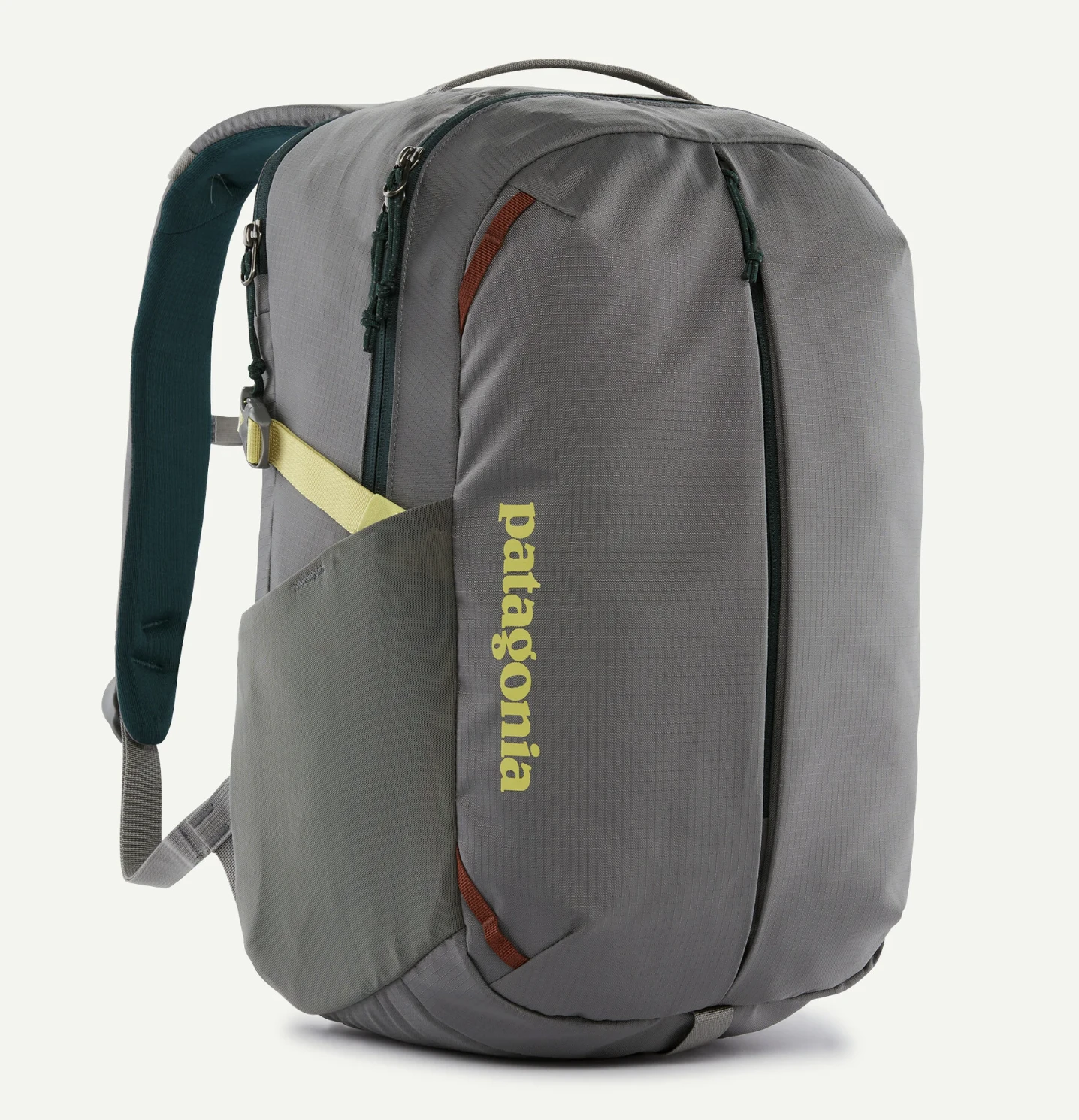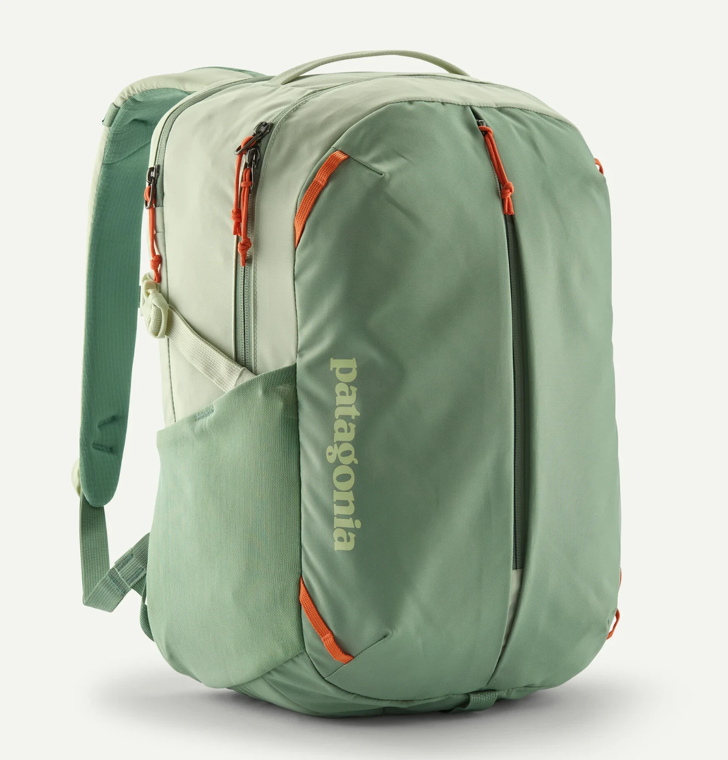 To resist light moisture, this 26-liter pack is treated with a durable water repellent (DWR) finish made without intentionally added PFAS; all fabrics are 100% recycled except the stretchy mesh for the side pockets, which is a 72% recycled nylon/28% spandex blend