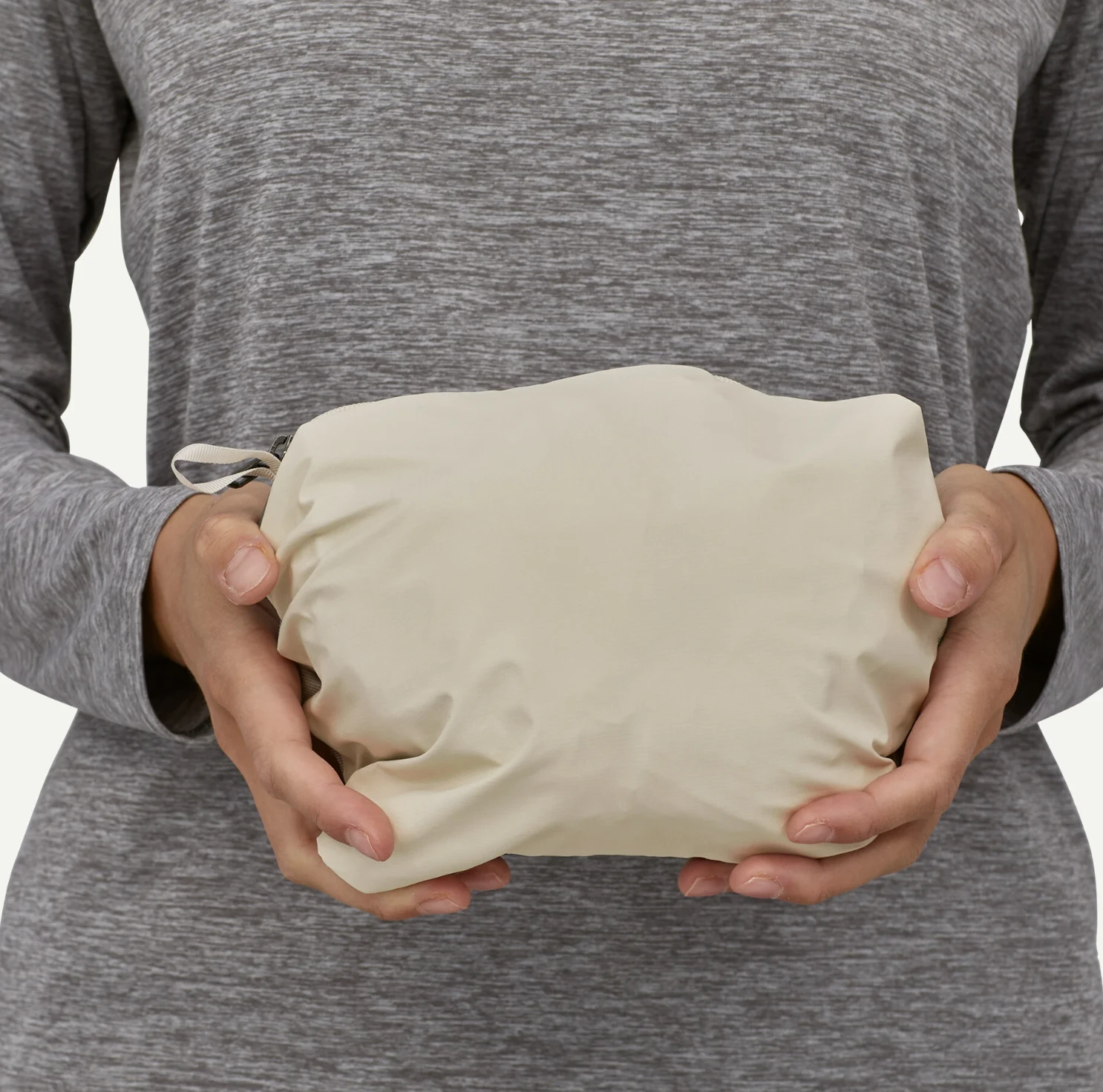 Two handwarmer welt pockets, and venting pit zips with welted exterior storm flaps; the jacket self-stuffs into the left handwarmer pocket with a carabiner clip-in loop