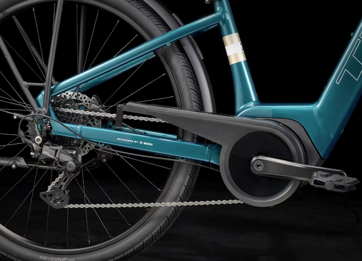 A lightweight Alpha Smooth Aluminum frame with lowstep geometry, a Bosch Active Line Plus (250W, 50Nm) motor capable of sustaining speeds up to 20mph, a Purion 200 remote, and a 400Wh battery. Plus, a 9-speed Shimano CUES drivetrain, hydraulic disc brakes, stable 27.5″ wheels with wide 2″ puncture-resistant tires for extra traction, a road-smoothing suspension seatpost, ergonomic grips, a kickstand, front and rear lights, and a MIK rear rack and fenders.